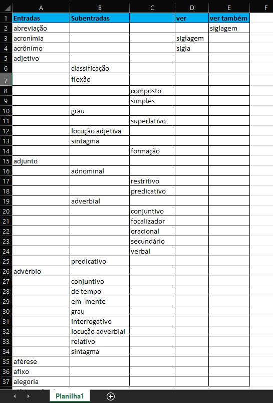 Faça o mesmo procedimento com as palavras constantes na lista de subentradas, ajustando-as para aparecerem no índice quando convier.